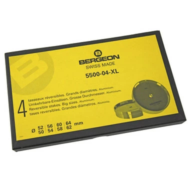 These are a “must have” for anyone who is closing watch backs on today’s HUGE watches. This four piece set of aluminum dies have tapered sides and are reversible. They have a 5mm mounting hole and fit the Bergeon 5500 case press.