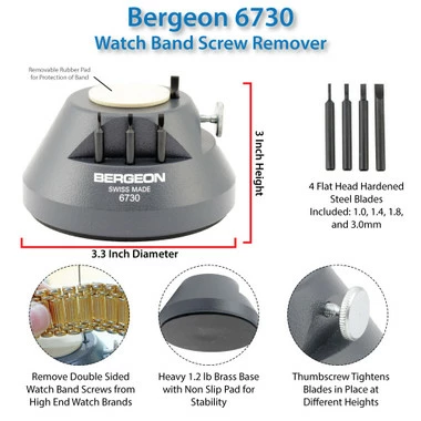 The Bergeon 6730 will hold watch bands while making Watch band adjustment and watch screw removal. This product is specifically designed and will make it many times easier to remove 2-sided watch band screws where both sides need to be held at the same time. It features a replaceable hardened flat steel screw working blade with adjustable height 4 sizes), removable rubber band protector on top, and a very stable surface to remove even the toughest watch band screws.