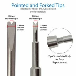 This fine quality steel spring bar tool is designed to last a lifetime. It is the perfect tool for removing spring bars from metal and leather watch bands. The 3.00mm larger forked end (6767-A) works great for opening standard spring bars, and the 1.20mm finer forked end (6767-AF) is just right for opening smaller and harder to reach spring bars. Features a textured grip directly on the stainless steel body. Each tip is removable and has identical threading making it easy and convenient to change or replace the tips as necessary for repair work.