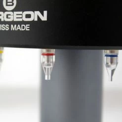 The 8935 is a Top-of-the-Line hand setting tool and represents the hallmark of Bergeon products: quality, innovation, function. Superbly constructed, the base and support post are metal and the head is made of a strong synthetic material. Four rubber pads on base keep extremely stable on the bench. Tool features four pressing holders or “runners” which are color and size coded and have slightly enlarged aluminum tops for precise control. The tips or “stakes” are transparent synthetic, non-marring material to protect hands and the dial. Three of the tips have openings (0.60, 1.20, 1.60mm) and one is solid. The base plate measures 31mm and is designed to fit the series 1996 Bergeon movement holders. Overall tool height is 7″, base footprint measures 4-3/4″ x 3-5/8″.
