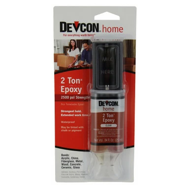 Devcon epoxy is a clear, extremely strong, non-shrinking adhesive, specially formulated for high-clarity and good impact strength. Use Devcon Epoxy adhesive for household, industrial, crafts or for any job that requires a high-strength, high-quality bond that is water-proof and dries clear. This Rapid-curing, general-purpose adhesive/encapsulant which easily dispenses and mixes in seconds, dries in 15 minutes and reaches functional strength in 1 hour. Works best on metal, wood, concrete, glass, fiberglass, stone ceramics, china and much more. Syringe style dispenser tubes allow you to release equal parts of both epoxy and hardener. Epoxy sets in 30 minutes with strength up to 2,500 lbs. per square inch.