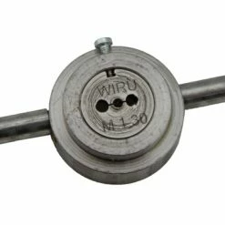Double ended die holder for metric dies used for threading wire or re-threading screws. Dies held in with a small set screw to keep in secure while threading.Â