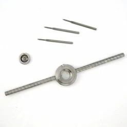 This handy tap and die set comes with twelve different tap sizes (3 pieces of each size) and twelve different screw dies that allow you to thread wire, re-threading stripped threads on screws, and even thread cases. It comes in a wood storage box keeps all taps and dies conveniently together with die holder. Perfect for working on small pieces that Jewelers and watchmakers commonly run into. Now you can repair stripped and damaged threads that were unrepairable before. Sizes include 0.4, 0.5, 0.6, 0.65, 0.7, 0.8, 0.9, 1.0, 1.1, 1.2, 1.3, 1.4mm for both tap and dies.