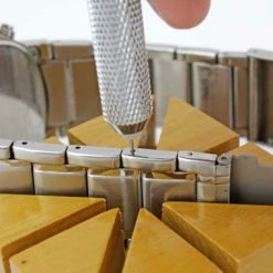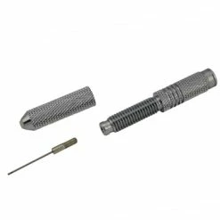 Heavy duty pin punch set for removing watch band friction pins. This three piece set features a adjustable pin so you use only the length you need to help prevent breaking the punch pin – a common complaint for pin punches. Simply screw down the tool end to make the pin longer or shorter. A nylon end won’t damage or scratch the watch while removing the band pin. Set of three punches include sizes: .7, .8, and .9mm with 1 spare pin for each; threaded pins are replaceable.