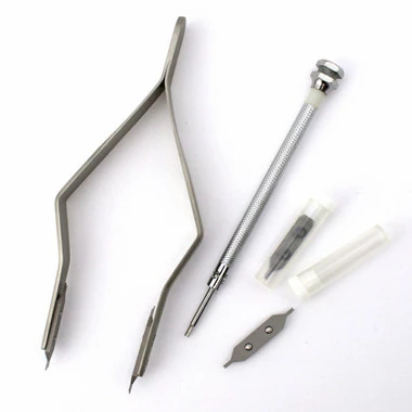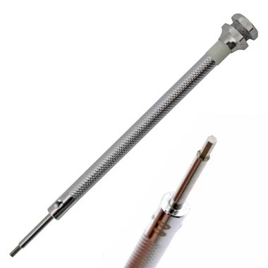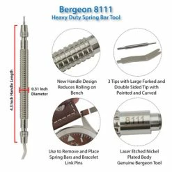 This professional grade tool removes spring bars without having to take the watch bracelet clasp off. Features a specially shaped stainless steel handle which aligns the tips and evenly compresses the spring bar for simple removal without slipping or scratching the case. Hardened steel tips are extra fine, just 1.0mm, ideal for brands with very little space between the case lugs and bracelet. Set includes the spring bar tool, a hex driver (1.4mm) to change tips, plus an extra pair of reversible tips. Overall size is 4.5″ x 1.75″.