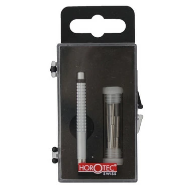 This watchband pin punch is used to remove friction pins from watch bands and bracelets. An integral item for the watch repairer’s tool collection, especially helpful when removing watch bracelet links attached with friction cotter pins. Supplied as a 12 piece set, this premium quality punch has a precise knurl for a comfortable grip and secure finger hold. Replaceable pins are hardened steel and friction fit into anodized brass handle.