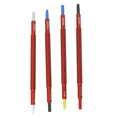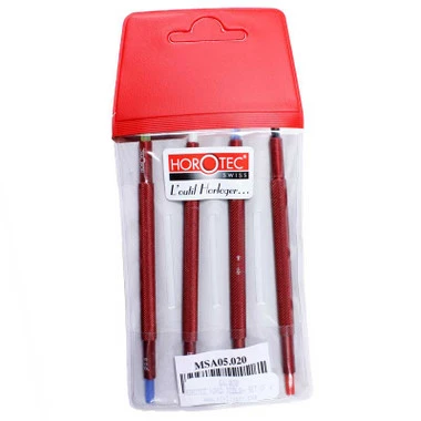 French made and recommended for quartz watch hand replacement and fitting (installation). These fine watchmakers tools have two ends that are plastic to protect the watch face and dial from scratches or marring. Features solid aluminum body and knurled grip that are both lightweight and sturdy for delicate work. This tool will help in putting the hands on with no slipping and even pressure so they do not bend the hands or the watch movement post. Double ended for various size watch hands and posts. 4 hand tool sizes included: 0.65mm/1.10mm, 0.80mm/No Hole (3.5mm solid end), 0.50mm/1.00mm and 1.50mm/2.00mm.
