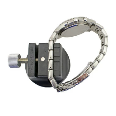 Here’s a ‘must have’ for the professional watchmakers or weekend watch repair warrior (enthusiast). This handy tool holds the watchband (up to 8mm thick) securely, allowing you to easily remove/install link pins or screws, and make other adjustments. Our band holding vise is made of a strong, non-marring composite material. Features a large thumb screw for smooth and easy adjusting. Wide base provides stability.