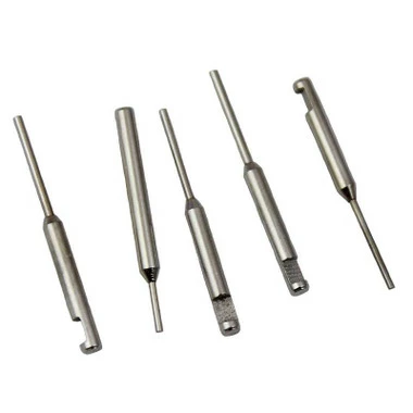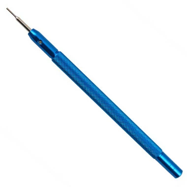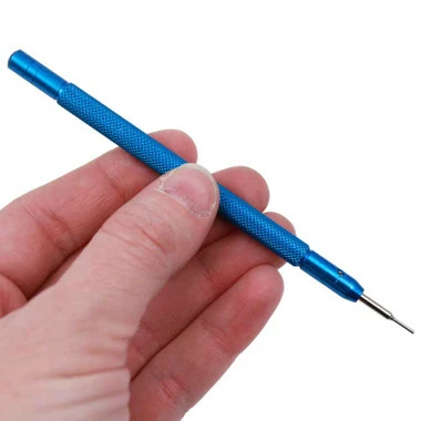 This is an upgraded version of the typical pin removing tool. Made of colored aluminum, this pin pusher is sleek and stylish. With just a tap of hammer watchmakers can repair, Seiko, Omega, even Department Style link bands with ease. This watch band pin removing tool is great for those easy link removals and for removing those stubborn links too. The punch comes with three long and three short pins in a polished tempered stainless steel and assorted diameters