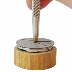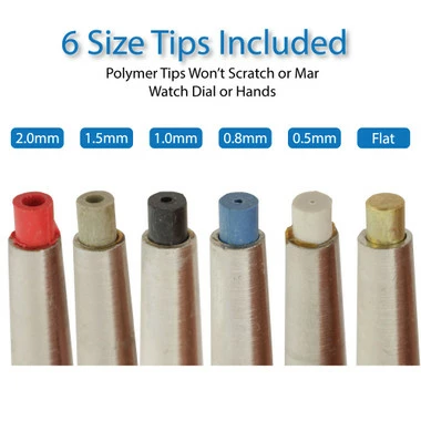 Quartz and mechanical watch hand presser watchmakers tool for replacing watch hands. Features steel construction with non scratching ends and a knurled grip. To help in putting the hands on with no slipping and even pressure so they do not bend the hands or the watch movement post. Double ended for various size watch hands and posts. Set includes 3 double-sided hand tools, 5 soft tips with varying size holes and 1 solid end brass tip.